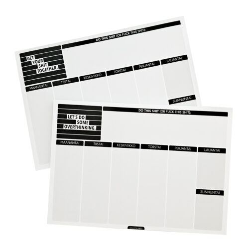 Viikkolehtiö Get Your Shit Together tai Let’s do some overthinking -tekstillä. Lehtiön sivun yläreunassa tilaa muistiinpanoille ja tehtäville, sekä sarakkeet viikon jokaiselle päivälle.