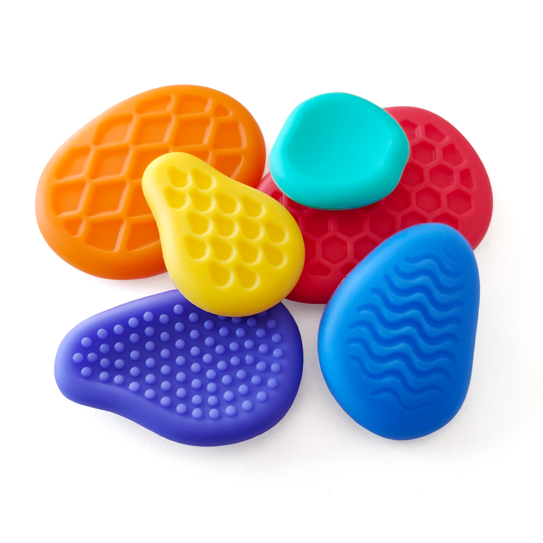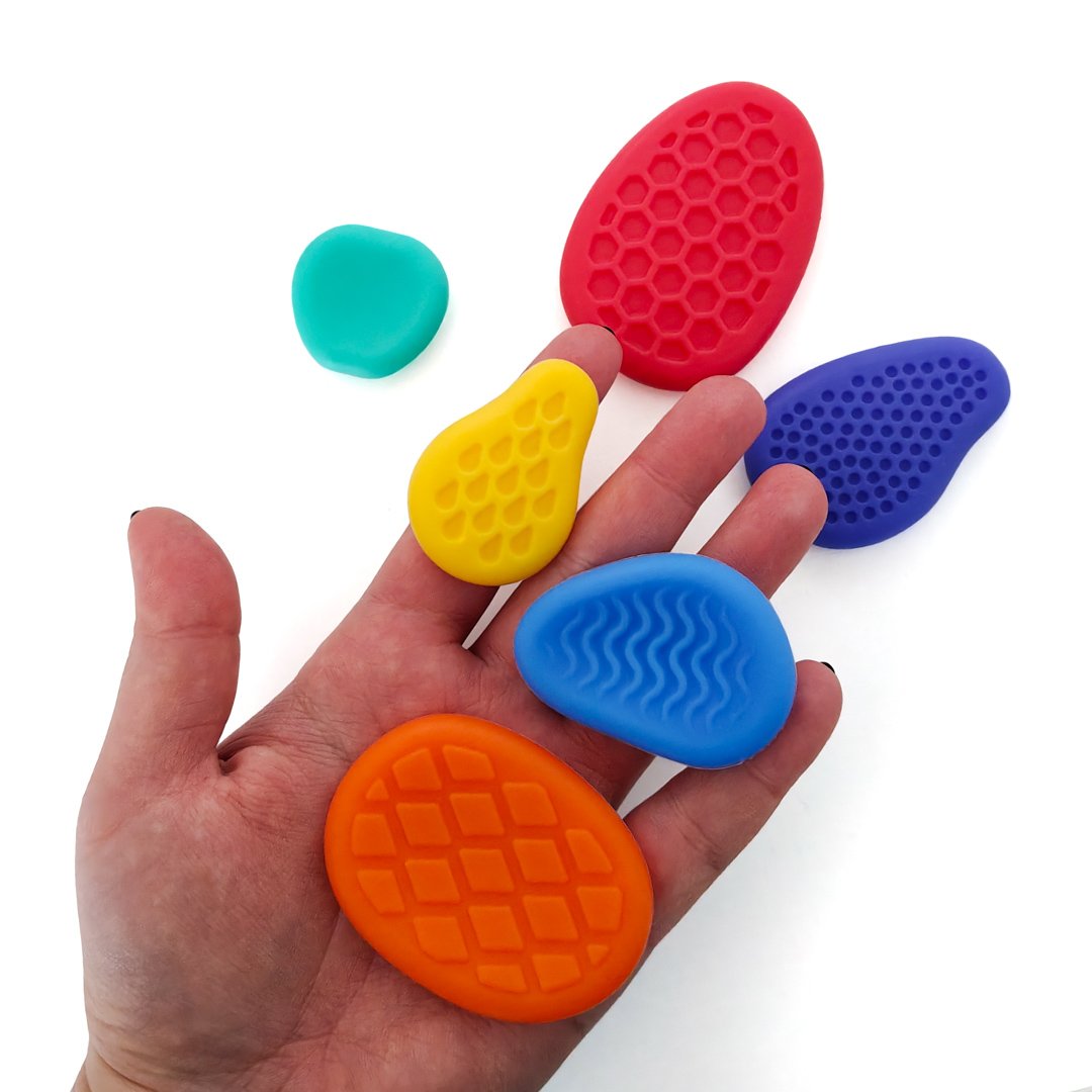 Hauskat silikoniset aistikivet eri kokoisina ja muodoissa. Kuusi kappaletta pakkauksessa.