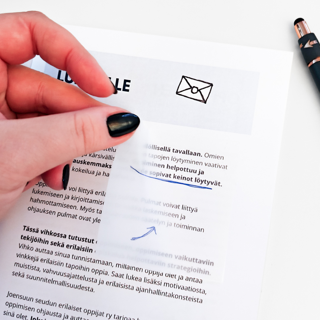 Läpinäkyvillä muistilapuilla teet muistiinpanoja ja muita merkintöjä ilman, että varsinaiseen tekstiin tarvitsee tehdä merkintöjä. Näppärää esimeriksi lainakirjojen kohdalla! Aseta lappu tekstin päälle ja kirjoita: alkuperäinen teksti pysyy siistinä, mutta sinulla on tarvitsemasi muistiinpano. Muistilaput sopivat niin toimistoon, opiskeluun kun kotikäyttöön.