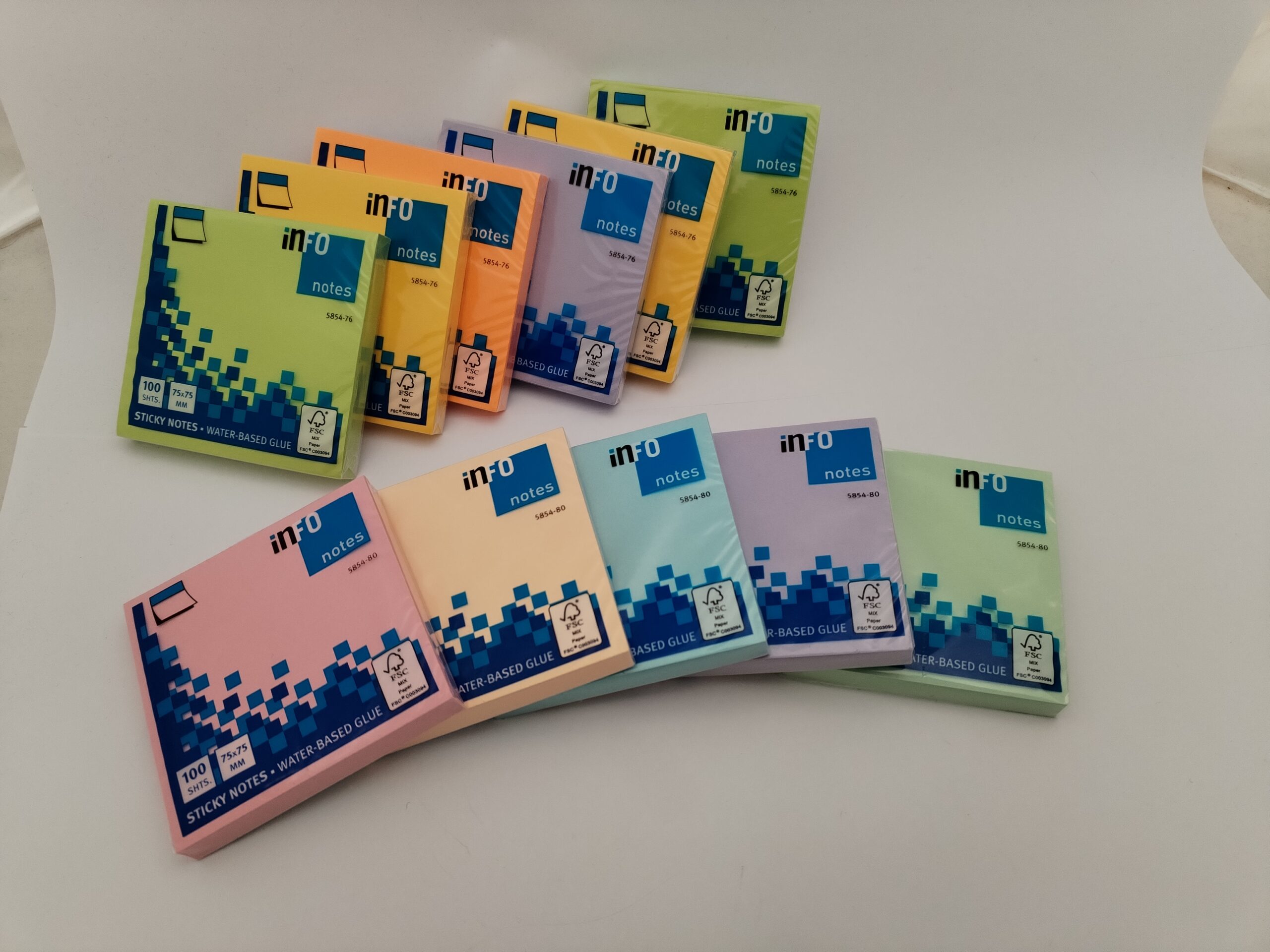 Neon väreissä pakauksessa 80 kpl muistilappua; muissa väreissä 100 kpl muistilappua.