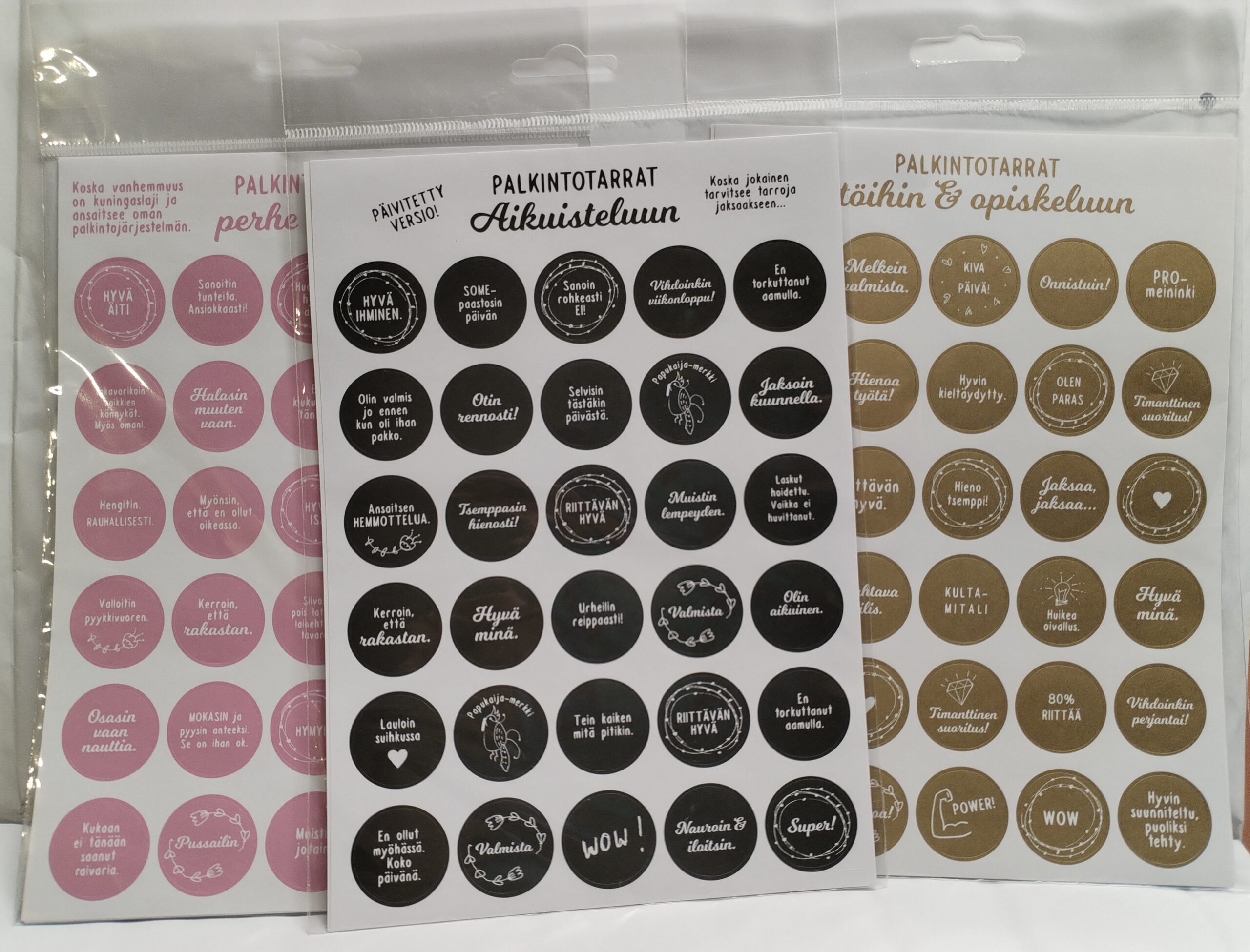 Valittavana kolme eri vaihtoehtoa: mustat tarrat aikuisteluun, kultaiset töihin ja opiskeluun tai pinkit perheen arkeen.